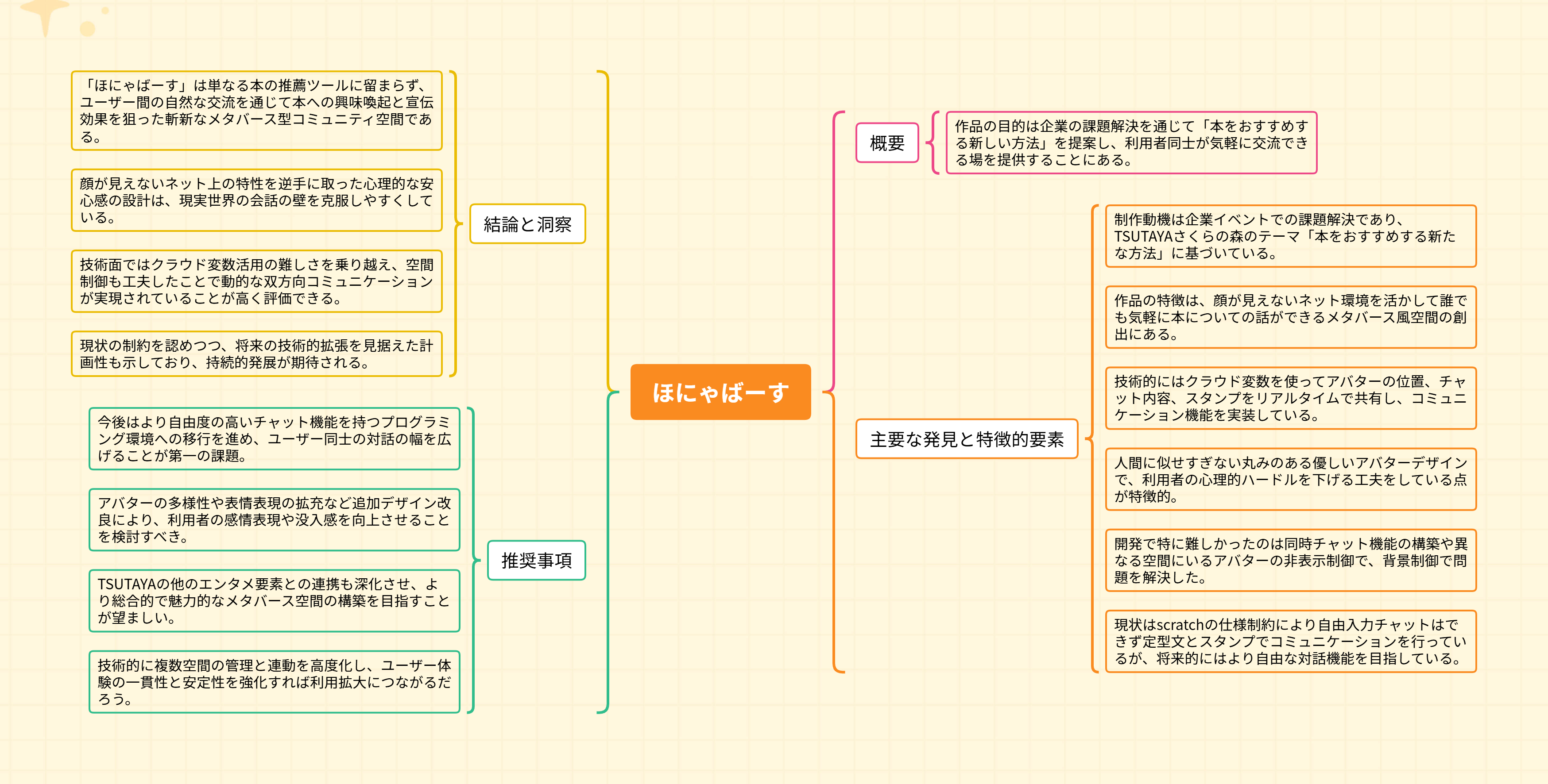 「企業の課題をプログラミングで解決する」イベントで、TSUTAYAさくらの森さんから「本をおすすめする新しい方法」を考える課題を受け、「本について語り合える憩いの場」をテーマに『ほにゃばーす』をScratchで制作しました。現実では会話に気兼ねして交流が友達や家族などに限られやすい点に着目し、みんなが本の感想や意見を言い合える場を用意して、周囲のおすすめ本への関心を広げ、自然な宣伝につなげる流れを考えました。クラウド変数でアバターの位置・会話内容・スタンプを共有し、矢印キーで移動、QキーまたはAキーでチャットを開いて定型文やスタンプを選びます。Scratchの仕様上、自由入力の会話はできません。相手が人間そっくりだと緊張しやすいと考え、人間に寄せず丸く優しいアバターにし、「ポテポテ」した可愛らしい動きも意識して描きました。初めて使うクラウド変数でチャット機能を実装する点や、会話表示を他アバターから見えないようにする制御に苦労しましたが、アバターごとの背景を用意して制御する方法で対応しました。自由入力チャットに対応した言語へ展開すれば、コミュニケーションの幅をさらに広げられます。