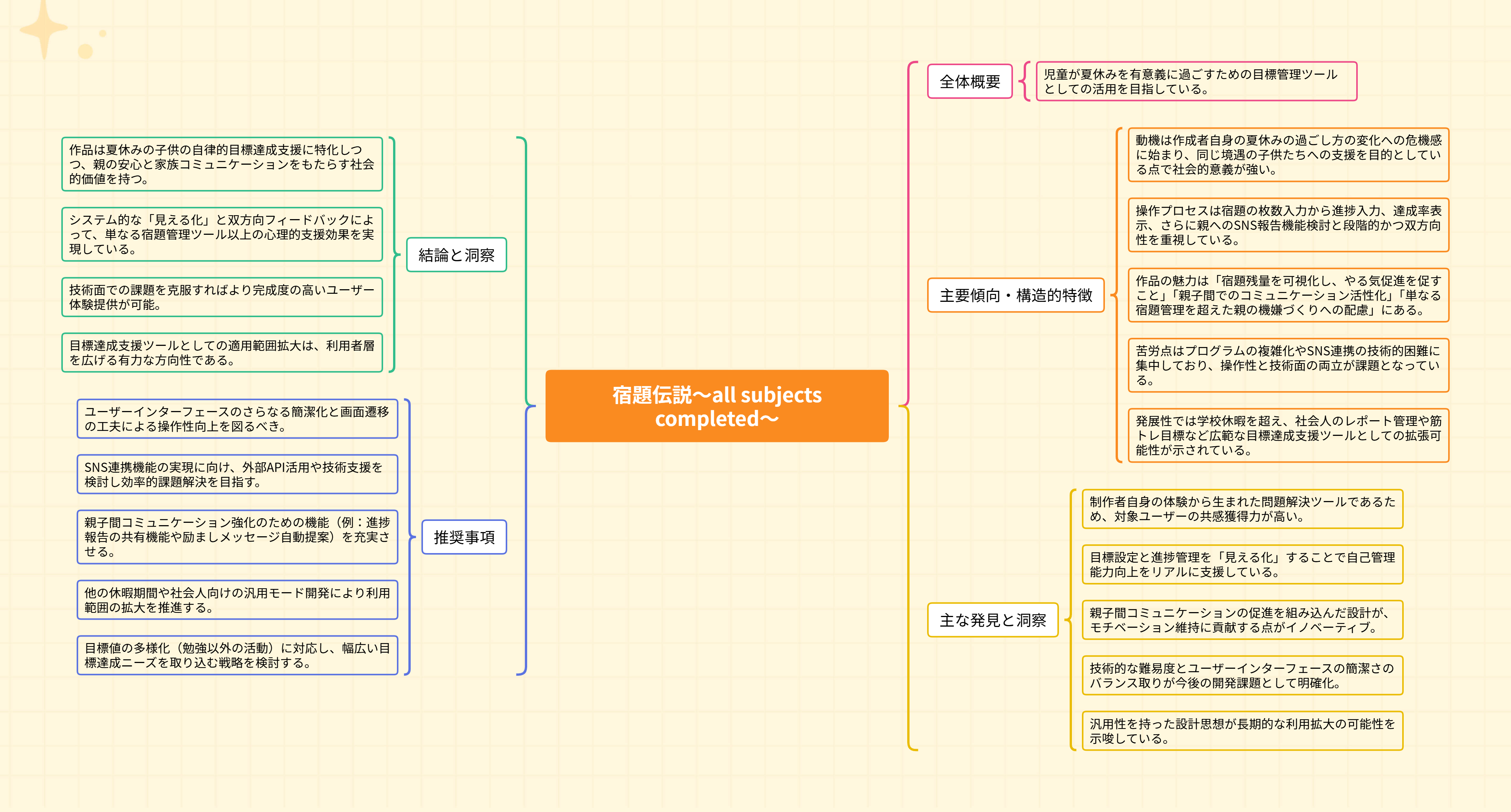 夏休みを計画的に過ごすための宿題管理アイデアを形にした作品です。夏休みに両親が仕事で家にいない時間があり、寝てゲームをしているうちに日にちの感覚が薄れ、このままではまずいと感じたことをきっかけに制作しました。何気なく過ごす毎日を、自分で目標を立てて取り組む毎日に変える狙いを置きました。初回に各教科の宿題枚数を入力し、曜日ごとに科目やお手伝いをスケジュールで確認します。今日の目標枚数を設定し、1時間後に達成枚数を入力すると目標達成率を表示し、残りページ数も一目で分かるようにしました。宿題が進み、お手伝いもできれば、親も安心して働きに行ける状態を目指しました。達成率を親へSNSで送る案も検討し、夕食時に進捗を話題にして励ましや声かけにつなげる想定も入れました。制作では残り数表示や画面の見やすさに苦労し、変数やメッセージを多用しつつ分かりやすいプログラムを目指しました。夏休みだけでなく冬休み・春休みにも使えるようにし、宿題以外の目標に合わせて「ページ数」を「時間」などに置き換えられる形まで整えると、一層実用的になると思います。