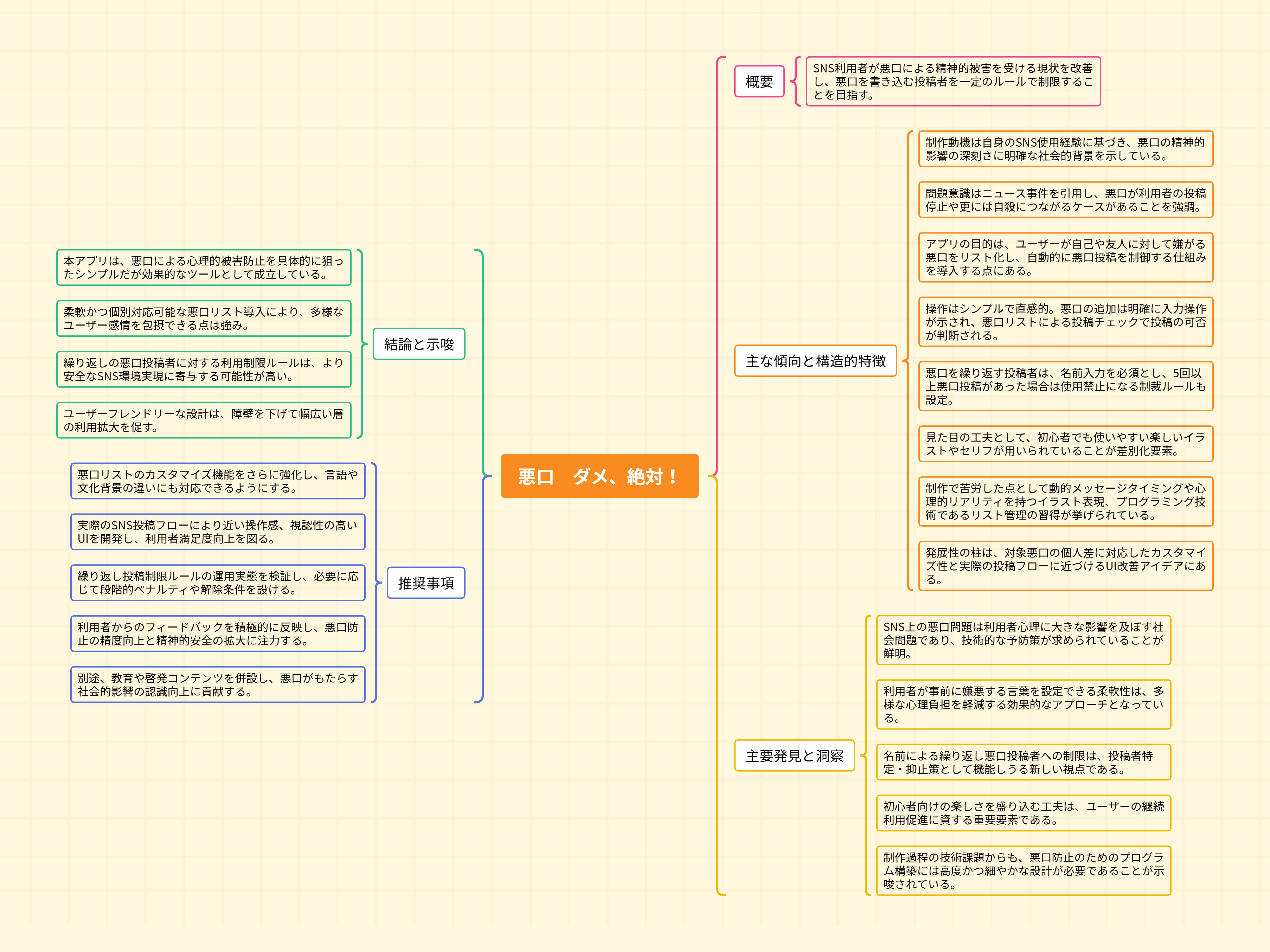 SNSのコメント欄で悪口を見かけ、書かれた側も見る側も嫌な気持ちになることから、悪口を「見ない」「投稿させない」仕組みをScratchで形にした作品です。ニュースで、悪口が原因でSNS投稿をやめた人や自殺に至った人がいることにも触れ、誰でも利用できる反面、無関係の人でも悪口を書けてしまう点を課題として捉えました。嫌だと思う悪口をボタンから入力してリストに追加し、悪口フィルターとして事前に用意します。投稿文を入力して確認すると、リストにない言葉は投稿でき、リストにある場合は注意を表示します。しつこく悪口を書く人への対策として、投稿前に名前入力を求め、悪口投稿が5回以上になると使えなくする設計にしています。初めてでも使いやすいよう、イラストやセリフで見た目も楽しくしました。制作では、メッセージによるセリフのタイミング調整、イラスト作成、初めて使うリスト機能の活用に苦労しました。嫌だと思う言葉は人によって違うため利用者ごとに悪口を変えられる点を強みとし、投稿の流れや見た目を実際のSNSに近づければもっと良いものになると考えています。