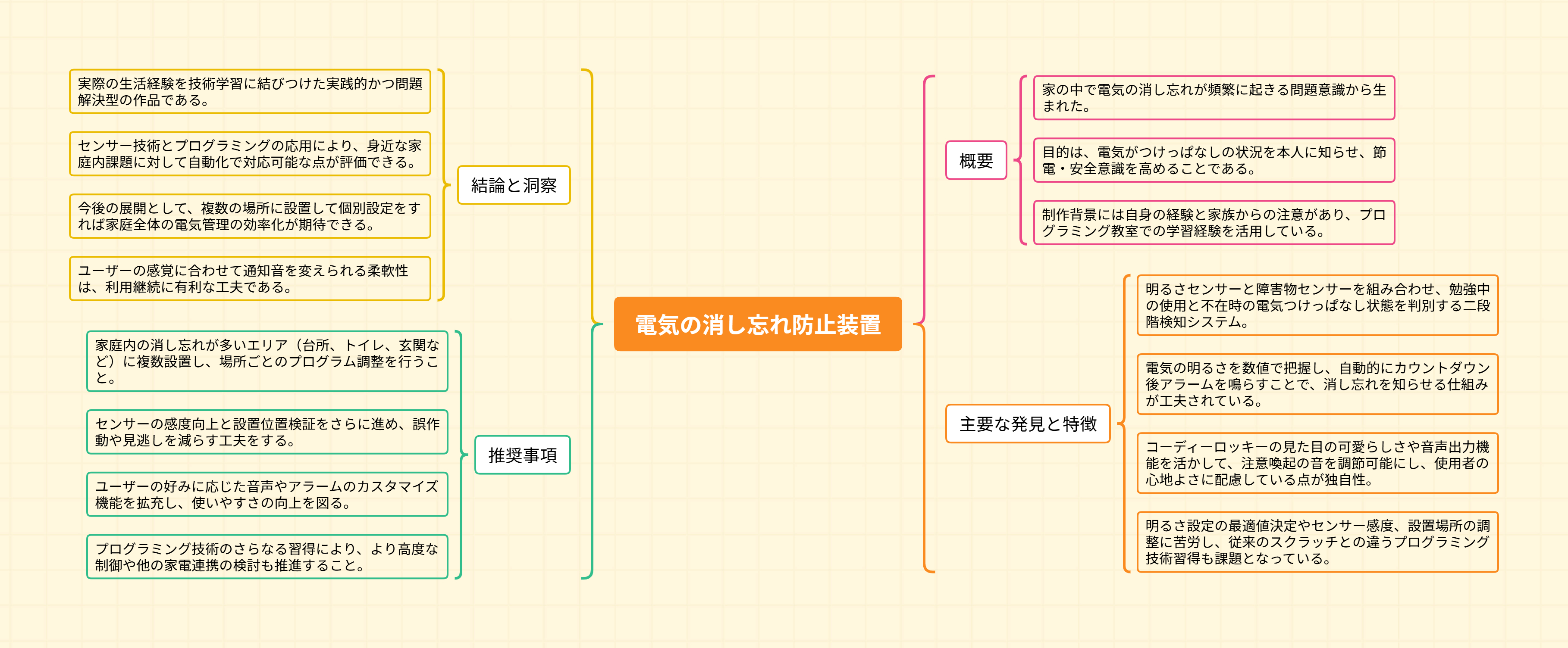 電気の消し忘れを減らし、節電につなげる狙いで「電気の消し忘れ防止装置」をmBlock×コーディーロッキーで試作しました。家の中には電気が多く、机のライトもつけっぱなしにして注意されることがあり、本当は自動で消えてほしいものの、まずは自分で気づいて消せる仕組みが必要だと考えたからです。以前プログラミング教室で使ったコーディーロッキーに多様なセンサーがあることを思い出し、「人がいないのに電気がついていたらアラームで教える」形にまとめました。明るさセンサーと障害物センサーで状態を捉え、条件に合うとカウントダウンが始まり、10秒後にアラームで通知します。見た目が可愛く、音や声を自由に出せる点も活かし、今回は注意喚起のためわざと激しい音にしましたが、優しい音や可愛い声にも調整できるようになっています。制作では部屋と机の明るさを測って数値設定に悩んだことや、障害物センサーの反応距離、普段のScratchと違うブロックの扱いが難しく先生に教わりながら進めました。自室での活用に加え、台所やトイレなど置き場所ごとに時間の長さを変える設定例まで整えると、家の中で展開しやすくなります。